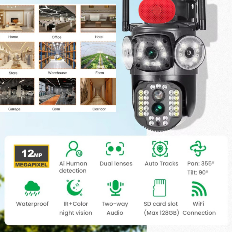 1. کیفیت تصویر: با دو لنز واقعی و دو لنز ماکت LED دار و سنسور 12 مگاپیکسل واقعی، این دوربین علاوه بر اینکه تصاویری با وضوح بسیار بالا و جزئیات دقیق فراهم میکند، حالت بازدارندگی خیلی بالایی هم ایجاد میکند. این کیفیت برای محیطهای بزرگ و نقاطی که نیاز به پوشش وسیع دارند، بسیار مناسب است. همچنین لنز بالای این دوربین، با زاویه باز و وسیعی که دارد، تصویری بازتر از لنز های معمولی به شما ارائه میدهد که باعث میشود شما درون برنامه سه تصویر همزمان داشته باشید.